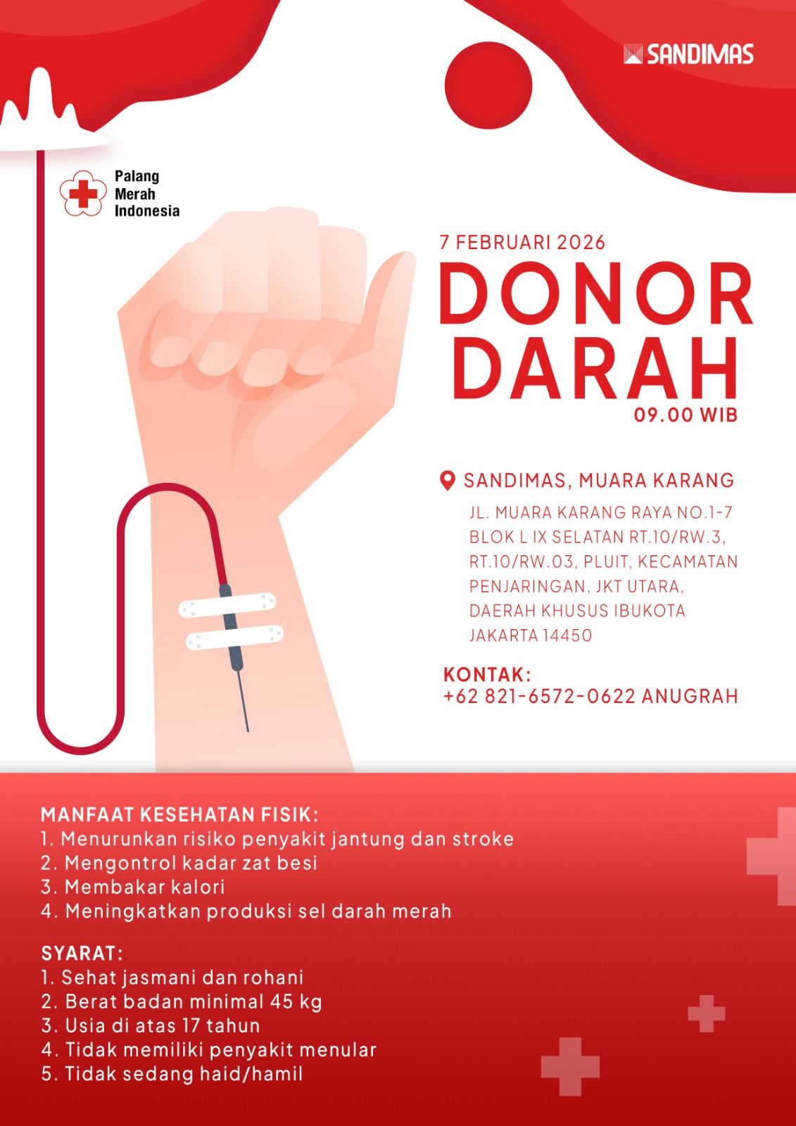 SANDIMAS Group memahami pentingnya manfaat donor darah baik bagi penerima maupun pendonor, sehingga akan menyelenggarakan kegiatan donor darah dengan detil pelaksanaan :